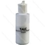 Powder flask with removable nozzle and cap, filled with talcum powder.